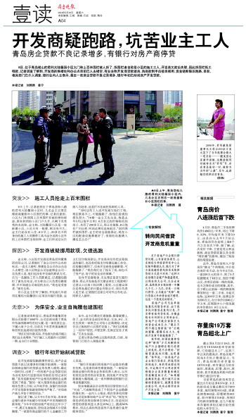 开发商疑似跑路,近半年“人间蒸发”。今年5月初,崂山君利大陆馨园小区的开发商欠款后失联,有业主称开发商贷款建房,购房款到手后擅自挪用,资金链断裂后跑路。事发近半年时间,如今开发商依然下落不明。银行业内人士表示,最近一些房企贷款不良记录增多,银行年初已削减房地产开发贷款。