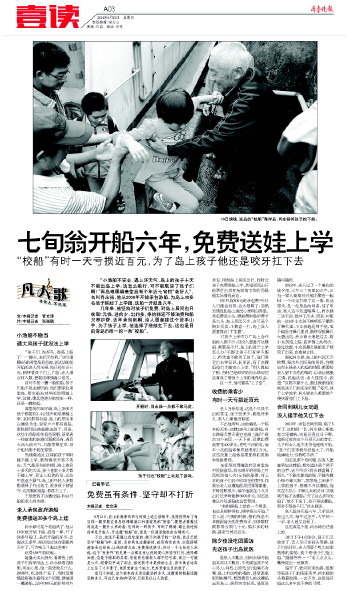 老人和孩子们的心通过这艘爱的校船,紧紧联系在了一起,老人喜欢看孩子们天真无邪的笑脸,喜欢听他们在船上嬉戏打闹的笑声。我们不知道这个赔本的买卖还能坚持多久,这艘爱的校船还能坚持多久,可这已有的六年坚守,足以让人动容。