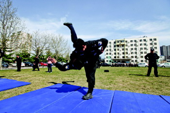 特警机动队民警训练“切别摔”。