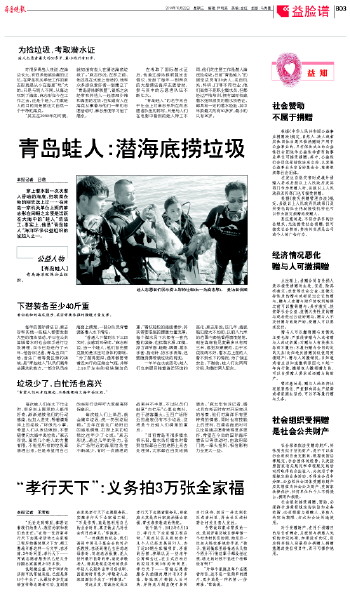 对很多身在青岛的人来说,做公益已经是生活中不可或缺的一部分。如今,活跃在岛城的公益团队有很多,他们用自己的行动和爱心,默默践行着“情暖人间”的理念。他们中既有自发组团清理海底垃圾的“青岛蛙人”团队;也有见市民打车难,自发成立车队,捎人一程的金飘带公益顺风车队;还有全国首个关注服刑人员子女的“小草基金”。