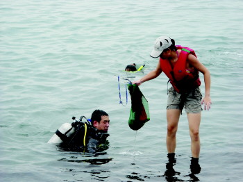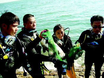 浮上水面后,蛙人将垃圾交给岸上的志愿者。(资料片)