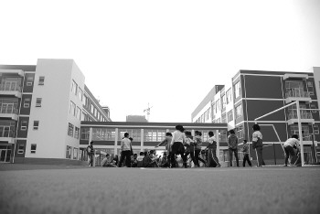 17日,朝阳小学操场上,六年级学生曹蓝心正在与同班同学在塑胶运动场上体育课。“以前学校的操场是土质的,摔倒会很疼,现在的操场不仅摔倒了不疼,跑步的时候就像在红绿色彩的画中奔跑,很快乐。”曹蓝心说,这学期第一天,她和同学们搬到了现在的新学校。