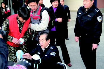 市公安局交警支队工作人员为学生的自行车贴反光贴。