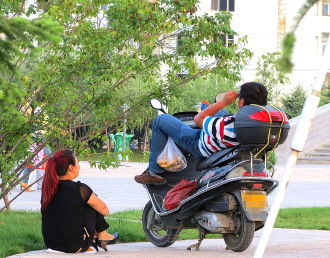 时间:2014年9月1日 自述:男子仰卧在摩托车上,女子则坐在一边。 点评:两人各“坐”各的。
