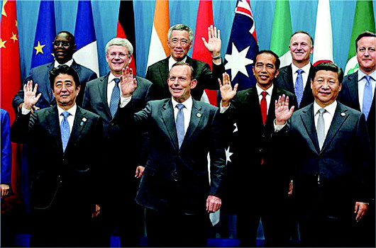 中日澳领导人在澳大利亚布里斯班G20峰会上的合影,阿博特(前中)夹在中日领导人中间,似乎是对澳大利亚“平衡术”的暗示。