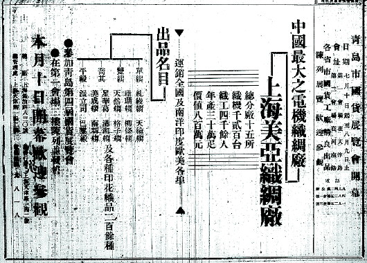 1933年7月10日至8月9日举办的青岛第四次国货展览会,在青岛国货展览会历史上规模最大,参加展览的有青岛市和上海、杭州、天津等市工厂200余家,产品6300余种。上海市总商会对此次青岛国货展览会非常重视,精心组织了由106家厂商参加的规模庞大的国货旅行团,在上海市总商会董事王介安率领下来青参会。
