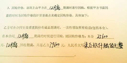 在刘先生提供的一份合同中,公司以25600元高价出售乌克兰整版钞大全产品,承诺年底以79600元回购。