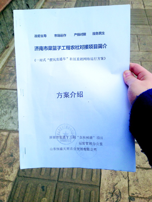 山东三箭物业管理有限公司瑞福苑物管部于经理表示,当时引进恒盛天雨公司进小区卖菜本想方便居民,此公司不仅可以进社区卖菜,还可以电话订购送菜上门。并且当时该公司出具了一份《济南市菜篮子工程“农社对接”项目,一站式“便民直通车”社区直销网络运行方案介绍》,上面盖有“济南市菜篮子工程农社对接项目运营管理办公室”、“山东恒盛天雨农业开发有限公司”的公章。