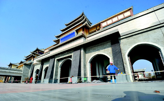 18日,位于济南槐荫区吴家堡的非物质文化遗产博览园内,宏伟的仿古大门颇具规模。据工作人员介绍,目前,园区内的16个主题馆土建工程已经完成95%,园区道路、湖泊、地形绿化工程也基本完成,有望2015年春节试运营。 本报记者 王媛 摄