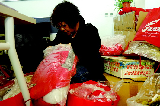 ◥齐鲁志愿者帮助挑选适合孩子们的爱心棉衣。