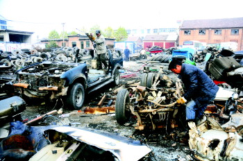 11月初,黄标车限行区域的再次扩大,在德州黄标车定点拆解场,每天约40余辆黄标车被切割、拆解。图为19日的拆解现场。 本报记者 马志勇 张磊 摄影报道