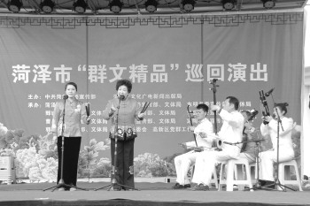 19日,由中共菏泽市委宣传部、菏泽市文广新局主办的菏泽市“群文精品”巡演首场演出在西关体育场举行。弦索乐《戏韵》、大平调《收姜维》选段、坠子《惊变》等节目博得观众阵阵掌声。之后,菏泽市“群文精品”巡回演出将走进各县,为市民送上一份丰富的精神大餐。