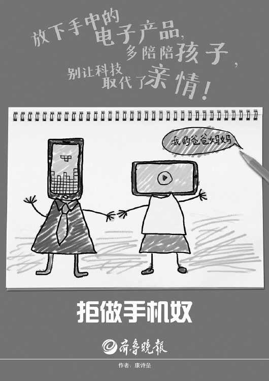 本报济南11月20日讯(见习记者 周国芳) “别让科技取代了亲情”,济南市民单希峰在齐鲁晚报网为“拒做手机奴”海报投下一票。为倡导合理使用手机,20日,本报推出三款主题海报,公开征求意见。截止到20日19时,已有超过1600人投票参与。