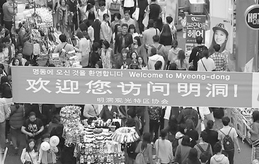 10月3日,韩国首尔著名购物区——明洞观光特区协会打出“欢迎您访问明洞”的横幅。