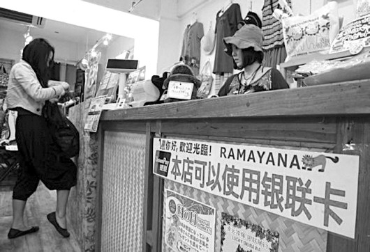 日本商家为吸引中国游客,贴出银联卡消费的标示。(资料片) CFP供图