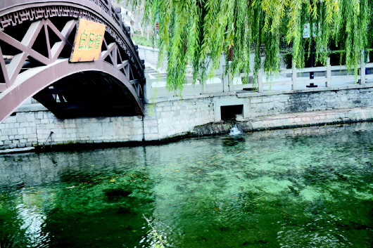 20日中午,记者从黑虎泉开始,顺着护城河沿岸,一路向北走。观察到黑虎泉至白石桥段的河水清澈见底,许多市民在附近打水。白石桥至青龙桥段,河水逐渐变浑,至青龙桥底已经十分浑浊。桥附近河水颜色呈淡绿色,水草漂浮在水面上,水浑浊不见底。继续向北走,河水浑浊情况逐渐减轻,至东湖平台附近,河水清澈度增加,能看见河底的水草。