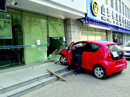 记者稍后赶到事发现场看到,车子冲上两个台阶后撞上了玻璃幕墙,3厘米厚的玻璃幕墙被撞出了一个直径约1米的窟窿。银行一间办公室满地都是玻璃碴儿。小车只有车头一部分撞入了银行。