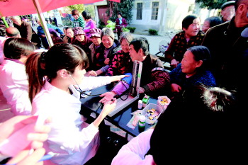 14日,世界糖尿病日到来之际,兖州区人民医院的健康直通车开进了兴隆庄镇王楼村,为村民现场免费检查、诊疗。整个义诊过程先后有300余名村民接受了检查、诊治,发放《卫生保健科普知识》等健康宣传资料500余册,受到群众一致好评。 本报通讯员 牛秀伎 徐雁鸿 摄