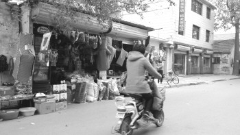 一市民骑挂有挡风被电动车打冬季用品店门口路过。本报记者 杨双媛 摄