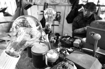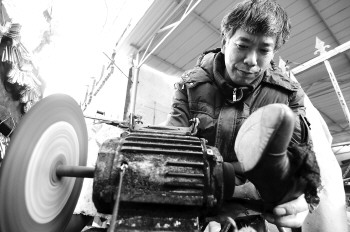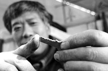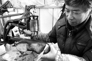 朱师傅修起鞋来一丝不苟。