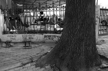 朱师傅摊位前的栅栏和梧桐树。