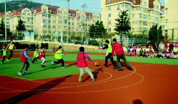 20日下午,青岛天山路小学首届“校长杯”亲子互动比赛开赛,几名二年级学生和家长组成的亲子队在操场上展开激烈角逐。比赛持续两周,设低年级亲子组和高年级男女混合组。