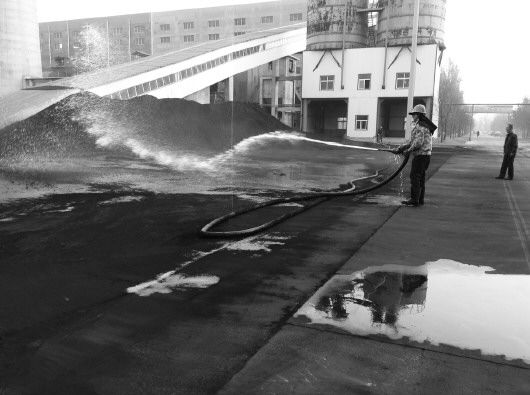 鑫谊热力公司工作人员在采用淋喷方式防止露天煤场粉尘弥漫。