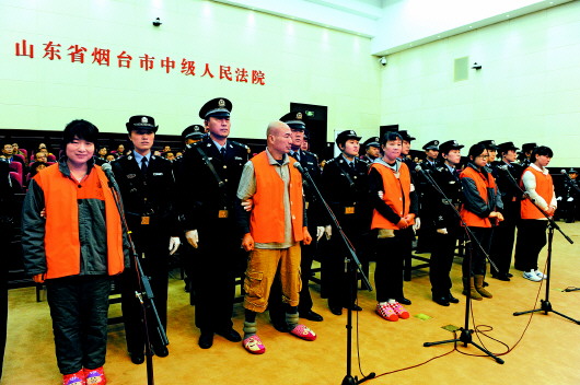 21日上午,招远涉邪教故意杀人案在烟台中院二审,5名被告再次站上法庭。在法庭上,一审被判死刑的张帆(左一)、张立冬(左二)和被判无期徒刑的吕迎春(中)对利用邪教组织破坏法律实施罪的罪名,全部不予认可,张立冬对自己的行为仍无歉意。 山东省高院 供图 A06 身边