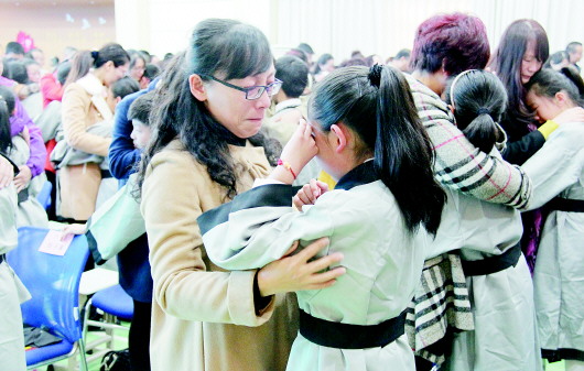 21日上午,孩子们面向家长鞠躬致礼,那一刻,家长才真正意识到,“孩子,你长大了”;当孩子们和家长相对而立,双手紧握在一起,孩子们说出“爸爸妈妈请放心,我一直在努力”的话语,早已有父母禁不住哽咽;当孩子们和父母拥抱在一起,孩子们再也忍不住,哭出了声音。