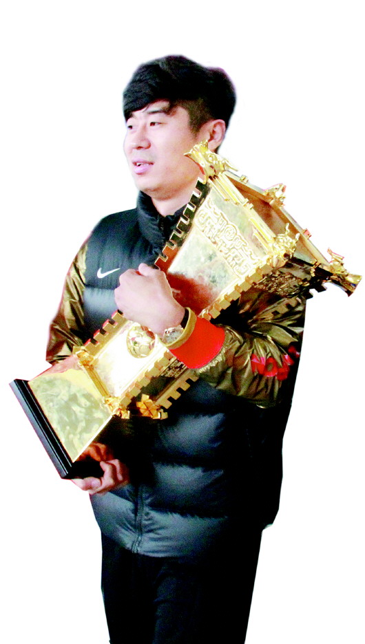 韩鹏怀抱冠军奖杯回到济南。