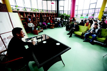 23日,在李村河畔的柳岸书吧,书法爱好者正在聆听书法讲座。为提升居民的文化修养,借书画名家李樯先生在青举办画展之际,书吧邀请李樯先生为社区居民、高校学生以及书法爱好者进行了一场书法、汉代碑刻知识讲座。