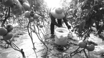 一位村民在大棚里采摘西红柿。 本报记者 彭彦伟 摄