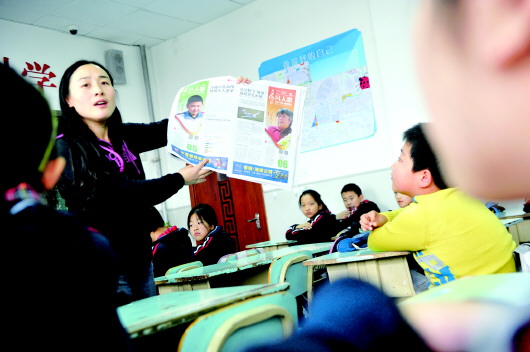 24日,在济南山师附小六年级二班,班主任于英新拿着当日的齐鲁晚报给同学们讲凡人善举公益海报背后的感人故事。 本报记者 王媛 摄