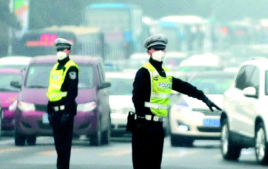 24日傍晚,经十路的滚滚车流中,交警在雾霾中执勤,他们不得不戴起了专用口罩。 本报记者 周青先 摄