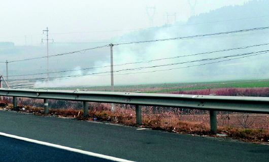 24日,济菏高速长清段,有村民在大田里焚烧秋天留下的秸秆,浓浓烟雾加剧了高速路的雾霾程度。 本报记者 周青先 摄