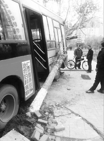 一位在附近公园散步的老人介绍,他从远处看到,公交车连撞两棵树,第一下刮擦撞出去,第二下直接撞在了树上。老人说,公交车停下后“骑”在了树上,挡风玻璃被撞碎,车几乎卡在两棵树之间,所幸人员没有受伤。据了解,公交车司机当时是为了躲避左侧突然向外变道的私家车,紧急打方向盘才撞上了路边树。
