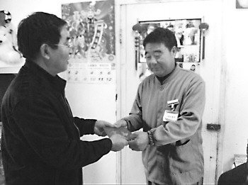 邹本江将奖金发到刘永祥手中。 本报记者 于飞 摄