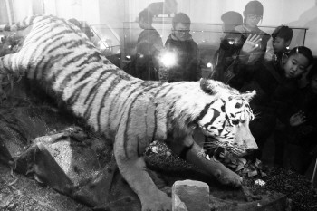 小记者观看老虎标本,近距离了解老虎的样子。 本报记者 李军 摄