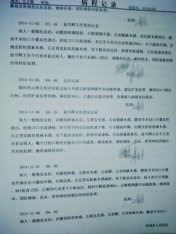 11月4日14时许,因腰椎狭窄症,王先生的父亲被推进武城县人民医院手术室,因需从省级医院请专家前来手术,王先生交给武城县人民医院一位姓赵的手术医生4000元手术费和500元“饭钱”。“当时治病心急,医生问我要500元饭钱我就答应了,我觉得这是向我们要红包。”王先生称,父亲19时30分被推出手术室后称左眼肿胀,视力模糊。