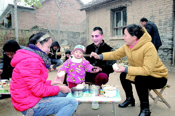上午的戏演完后,演员们开始在后台卸妆,“如果下午还上场的话,也只是简单卸,吃过饭后来不及休息还要上台演出,主要老百姓愿意看、愿意听,只要听到台下的掌声,再苦再累也无所谓。”宋秀敏说,演员们吃的都是大锅饭,由于屋内没有地方吃饭,他们都端着碗拿着馒头在院子里吃,有时热乎乎的饭菜吃着吃着就凉了。