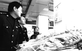 图为执法人员查看个体经营户的新版营业执照。