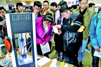 24日,东北五校2015届毕业生秋季供需见面会,在哈尔滨工业大学(威海)举行。现场,哈工大(威海)汽车工程学院的3D打印机研发团队借此机会展示研发产品,吸引商家投资。