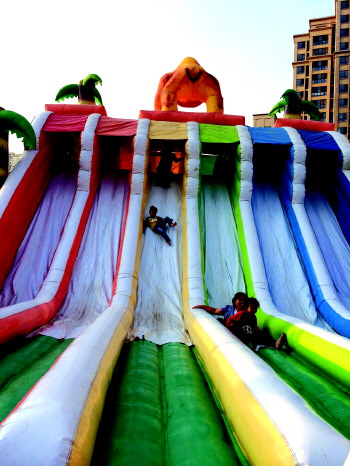 本次活动使用的快乐大闯关道具为充气式气垫赛道,总长80米,共设有飞檐走壁、能屈能伸、不进则退、翻山越岭等8个关卡。一次可通过6个孩子或4个大人。融趣味性、挑战性、互动性于一体,具有关卡最多、赛道最长、安全系数最高、趣味性最强等特点。