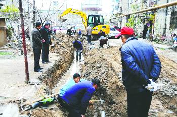 11月25日,天衢小区内施工人员正在铺设新的排水管网。近期,胜利社区居委会协调小区业主,以业主出资和政府补助相结合的方式对天衢小区进行供水管道和排水管网的改造工作,建立业主代表和居委会共同监督的管理模式,对工程施工进行监理,以期破解老旧小区的管理难题。