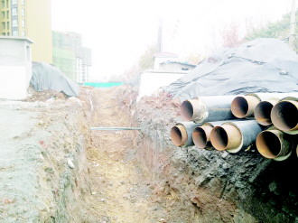 在江北绿城东北角,施工人员正准备铺设暖气管道。 本报见习记者 孙越 摄