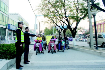 参加记满12分教育培训班的机动车驾驶人在红旗路与福州路路口执勤。 陶龙飞 摄