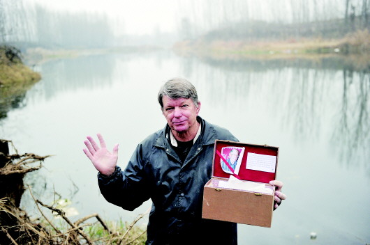 莱恩将骨灰盒里的骨灰轻轻撒进河中后拍照留念。 本报记者 王媛 摄