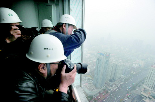 “长枪短炮”聚焦“第一高”。本报记者 王晓 摄