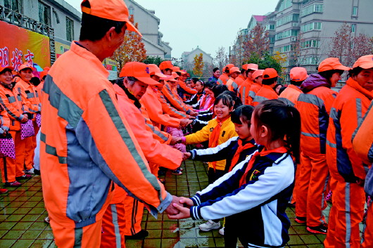 27日,山东大学第一附属小学三年级2班全体同学在家长和老师的带领下来到了阳光舜城社区环卫所,为51名环卫工人送去了他们用自己零花钱购买的防寒帽、护手霜和手套。“让我摸摸您的手可以吗?”孩子们轻轻抚摸着环卫工人的手,正是这一双双粗糙的大手,守护着城市的洁净。 (本记)