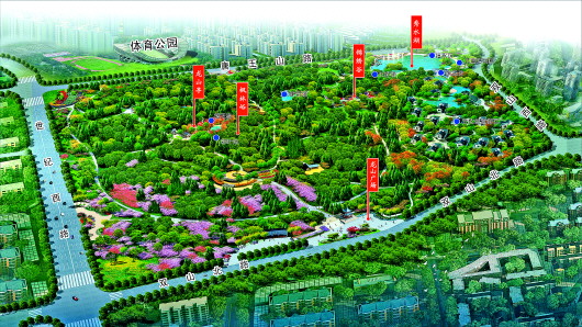 [山顶节点]为山顶观景平台,可眺望唐王山、胡山山影,全园景色尽收眼底。